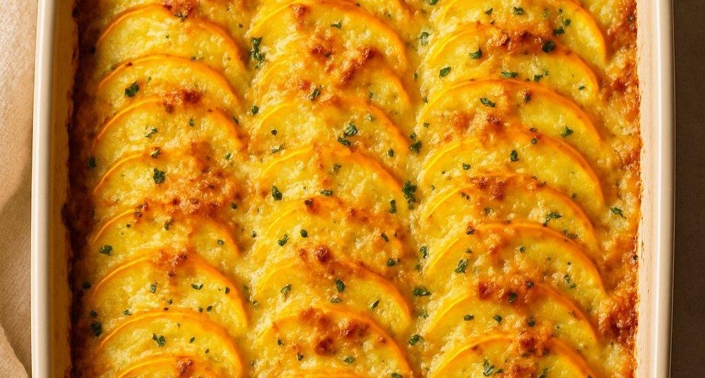 - Enfourner le gratin (avec béchamel et courge disposée en couches) pendant 40 à 50 minutes, jusqu’à ce que la chair soit tendre et la surface bien dorée.